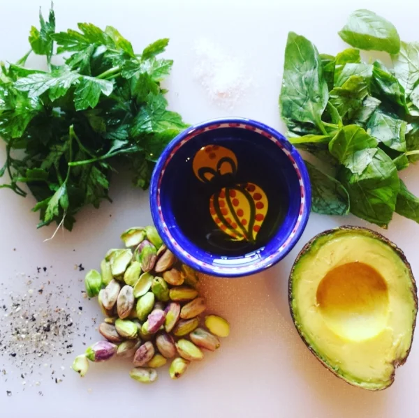 En un procesador de alimentos, añade los aguacates, las hojas de albahaca, perejil, ajo, piñones o pistachos, jugo de limón y sal del Himalaya y pulsa hasta que quede finamente picado. Luego, con el motor aún en marcha, añade el aceite de oliva en una corriente lenta hasta que la salsa este suave y cremosa.